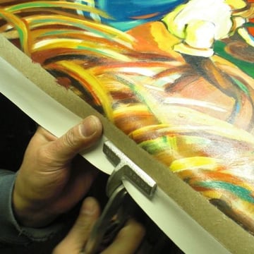 • Aufspannen von Leinwandbildern auf Keilrahmen nach Maß als Vorbereitung für die Rahmung mit Schattenfugenrahmen oder den Bildrand überlappenden Bilderrahmen.